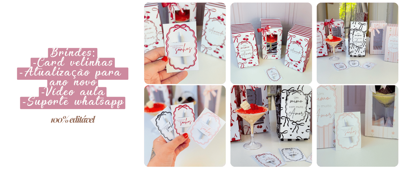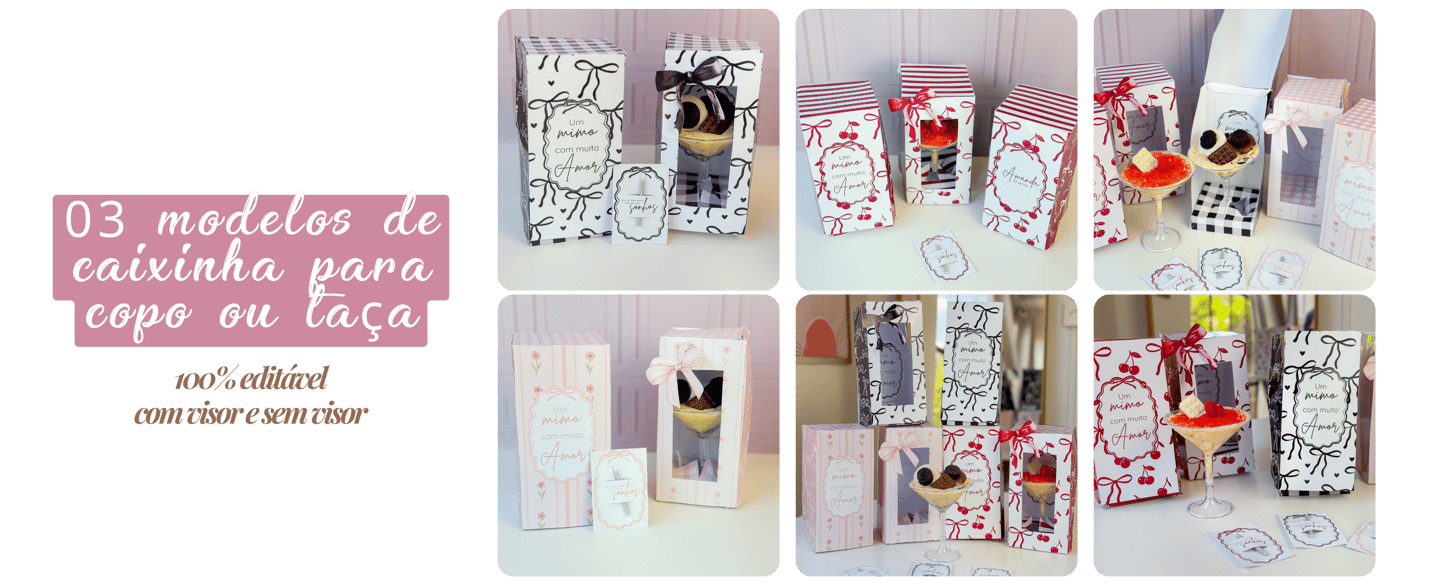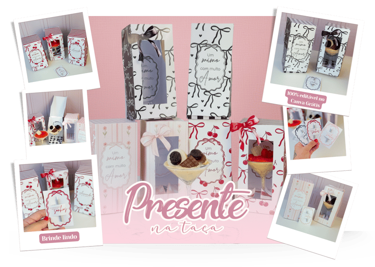 Se você trabalha com confeitaria, mimos ou presentes personalizados, essa caixa foi criada para facilitar sua produção e valorizar ainda mais o seu produto. Nossa caixa para taça (adaptável também para copos) é extremamente versátil e permite inúmeras combinações como: cake donuts, bolos, brownies, Brigadeiros, doces finos e kits presenteáveis. O kit é 100% editável no Canva grátis, super fácil de montar! O presente perfeito, infinitas possibilidades.